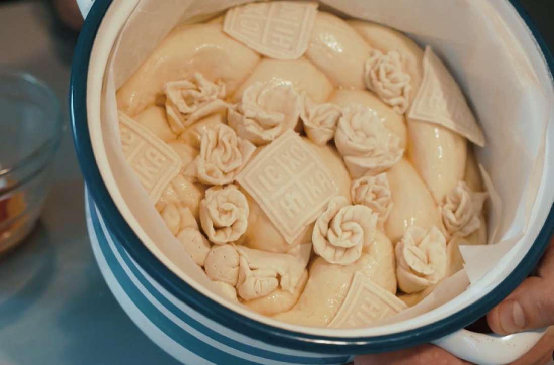 Sa svake strane krsta se stavljaju ćirilična pečatna slova IS HS NI KA, što predstavlja krilaticu: “Isus Hrist pobeđuje“. Takođe na kolač se dodaju još:
