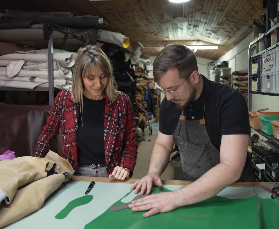 Aleksandar nam je pokazao kako se prave ručno rađene cipele u njihovoj radionici, pa je našoj Dragani pružio priliku da pokuša da iseče uložak za cipelu.