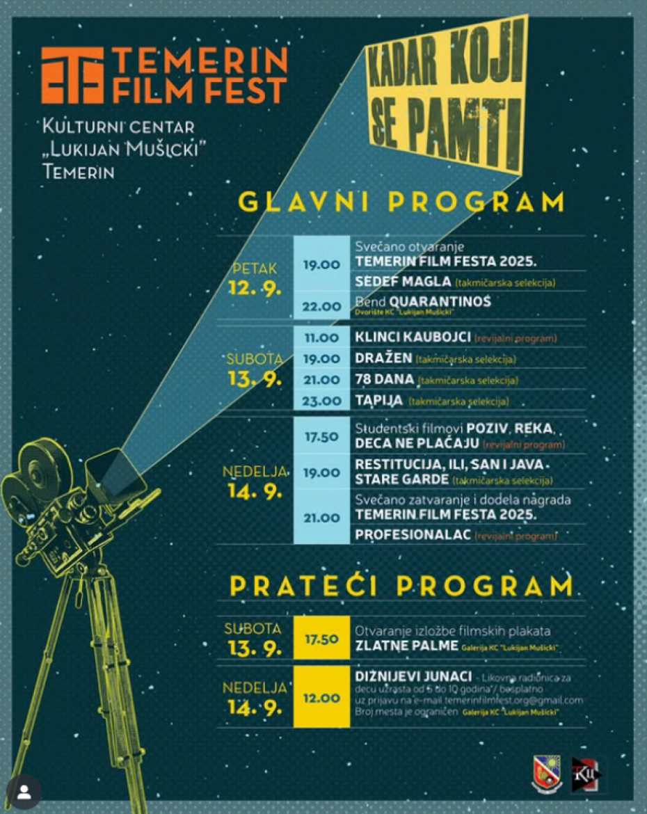 Temerin će do 14. septembra ponovo biti u znaku sedme umetnosti – počinje drugi Temerin film fest, pod sloganom "Kadar koji se pamti".