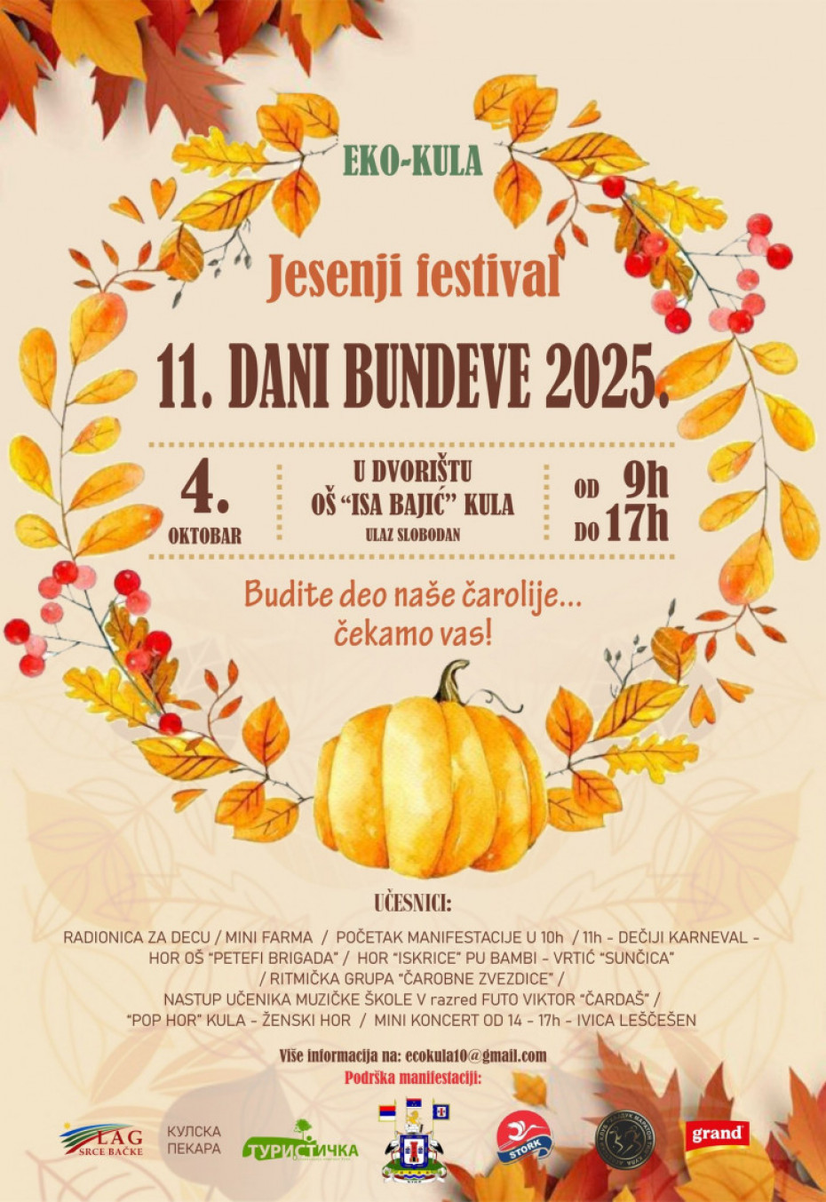 U dvorištu Osnovne škole „Isa Bajić“ u Kuli, u subotu, 4. oktobra, od 9 do 17 časova, biće održana jesenja manifestacija „Dani bundeve“. Posetioce očekuje bogat program – od radionica za decu i mini farme sa domaćim životinjama, do muzičkih i scenskih nastupa.