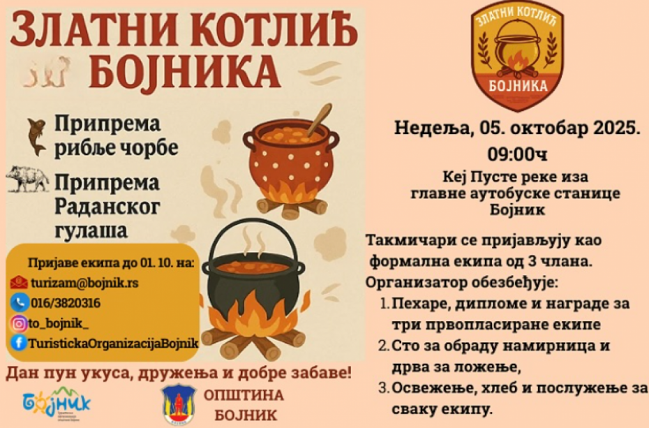 03.10.2025.Gastronomska manifestacija počeće u 9.00 časova na Keju, iza glavne autobuske stanice u Bojniku