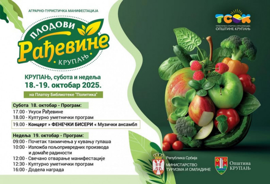 15.10.2025.Agrarno-turistička manifestacija "Plodovi Rađevine" biće održana u subotu i nedelju, 18. i 19, oktobra, na Platou Biblioteke "Politika" u centru Krupnja.