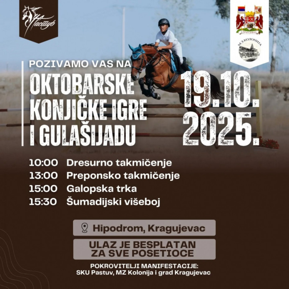 Na hipodromu u Kragujevcu, u nedelju 19. oktobra, biće održana tradicionalna manifestacija „Oktobarske konjičke igre i gulašijada“.
