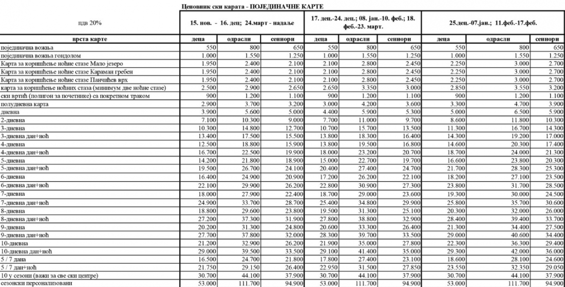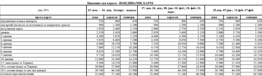 U susret novoj sezoni objavljen je cenovnik ski-karata, a cene su različite, u zavisnosti od perioda skijaške sezone i kategorije skijaša. Tako će, na primer, za odrasle cena šestodnevnog ski-pasa na Kopaoniku biti u rasponu od 24.900 do 27.100 dinara.