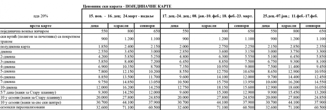 Šestodnevni ski-pas za odrasle na Staroj planini i u Ski-centru Tornik na Zlatiboru koštaće od 13.500 do 14.400 dinara, dvodnevni od 5.850 do 6.450 dinara, a jednodnevni 3.450 do 3.750 dinara. Cena poludnevne ski-karte biće od 2.400 do 2.850 dinara, stim da će ovaj ski-pas moći da se koristi četiri sata, bez obzira kada se započne skijanje.