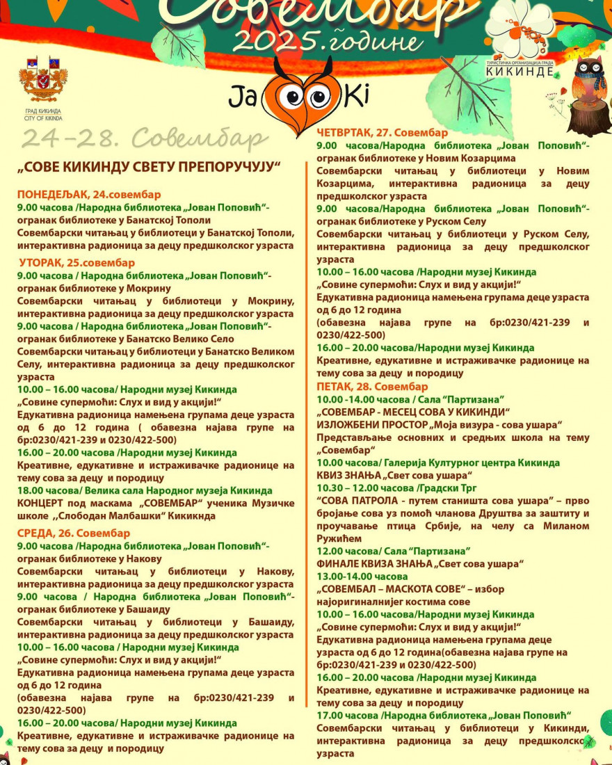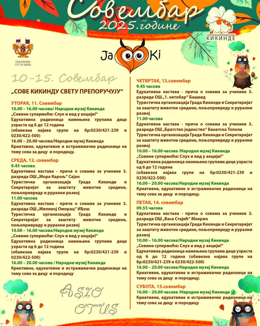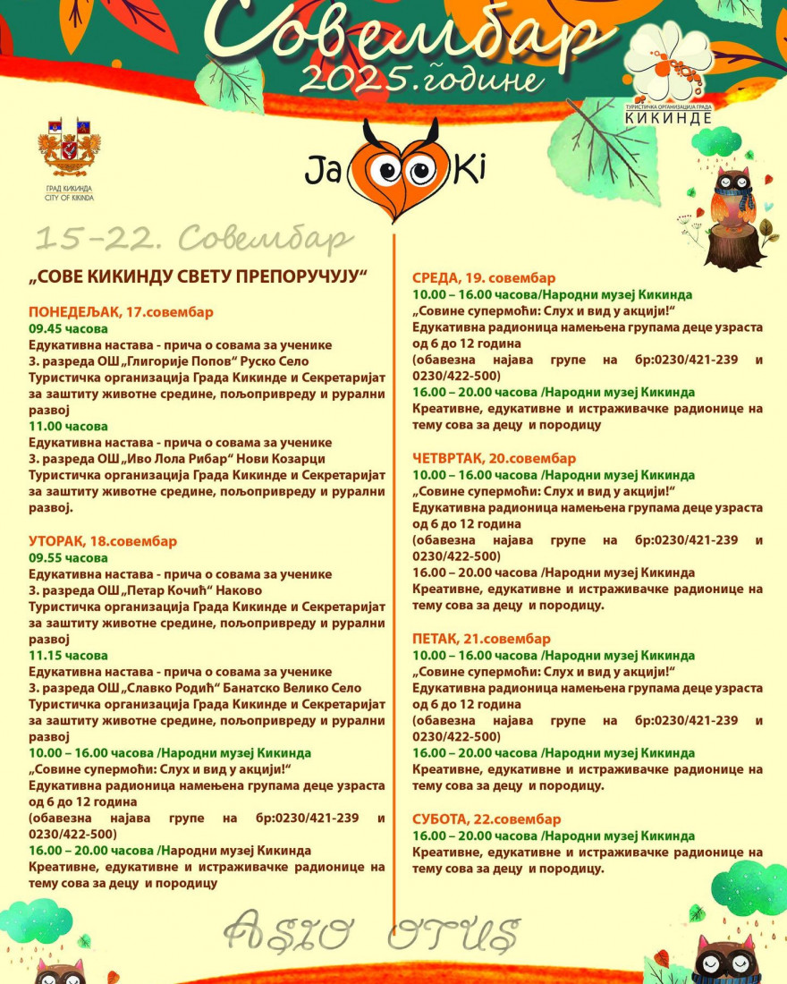 U vrtićima, osnovnim školama i ustanovama kulture, organizuje se niz radionica za decu, u saradnji sa Turističkom organizacijom grada. Vrhunac će biti kviz znanja i tzv. „sova patrola“ , koja se organizuje 28. novembra, kada će đaci sa orintolozima Društva za zaštitu i proučavanje ptica Srbije, ponovo brojati utine koje žive na drveću u centru grada.