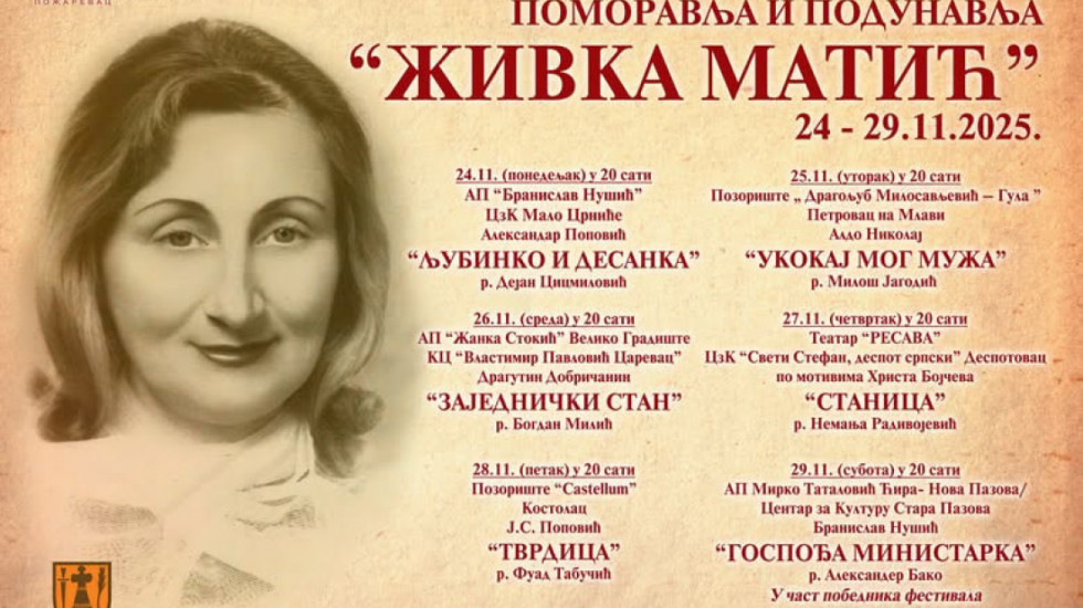 Ljubitelji pozorišta u Pomoravlju i Podunavlju uskoro će imati priliku da uživaju u bogatom programu 18. Smotre dramskih amatera „Živka Matić“, koja će se održati od 24. do 29. novembra u Centru za kulturu Požarevac.