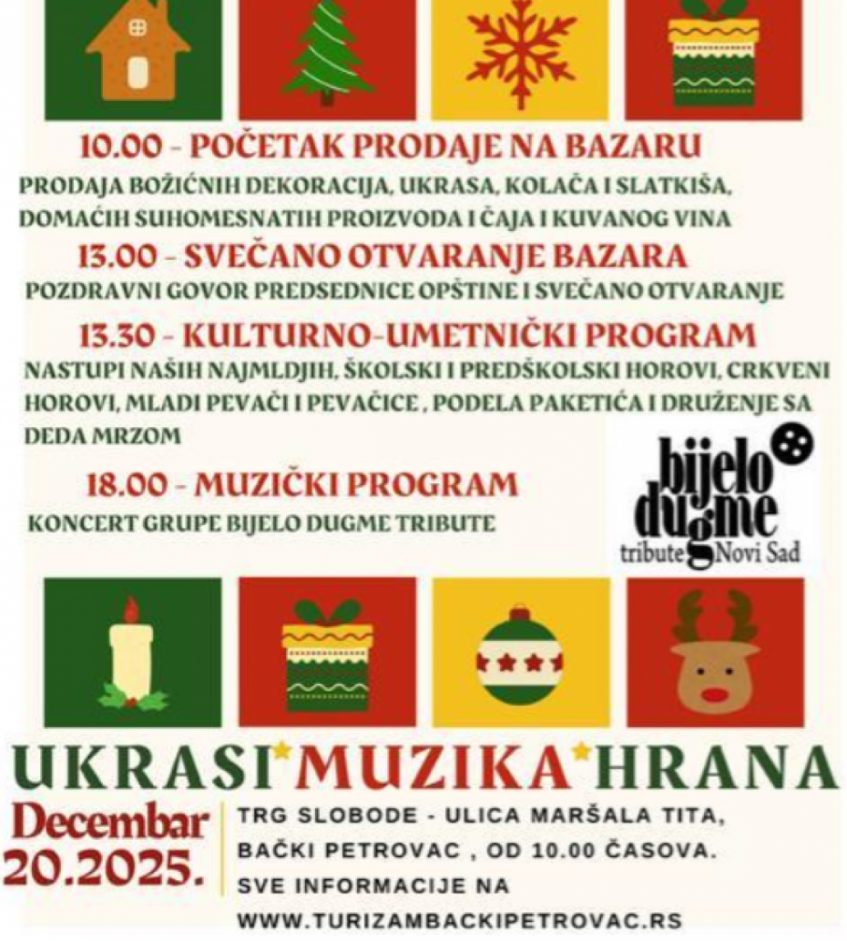 Posetioce očekuje velika ponuda božićnih dekoracija, kolača, kuvanog vina, cveća i poklona…bogat kulturno-umetnički program u kojem će najmlađi uneti duh Božića kroz pesmu, igru i ples…Pored toplog čaja, kuvanog vina i domaćih đakonija, atmosferu će dodatno zagrejati rok grupa Bijelo Dugme Tribute Novi Sad!
