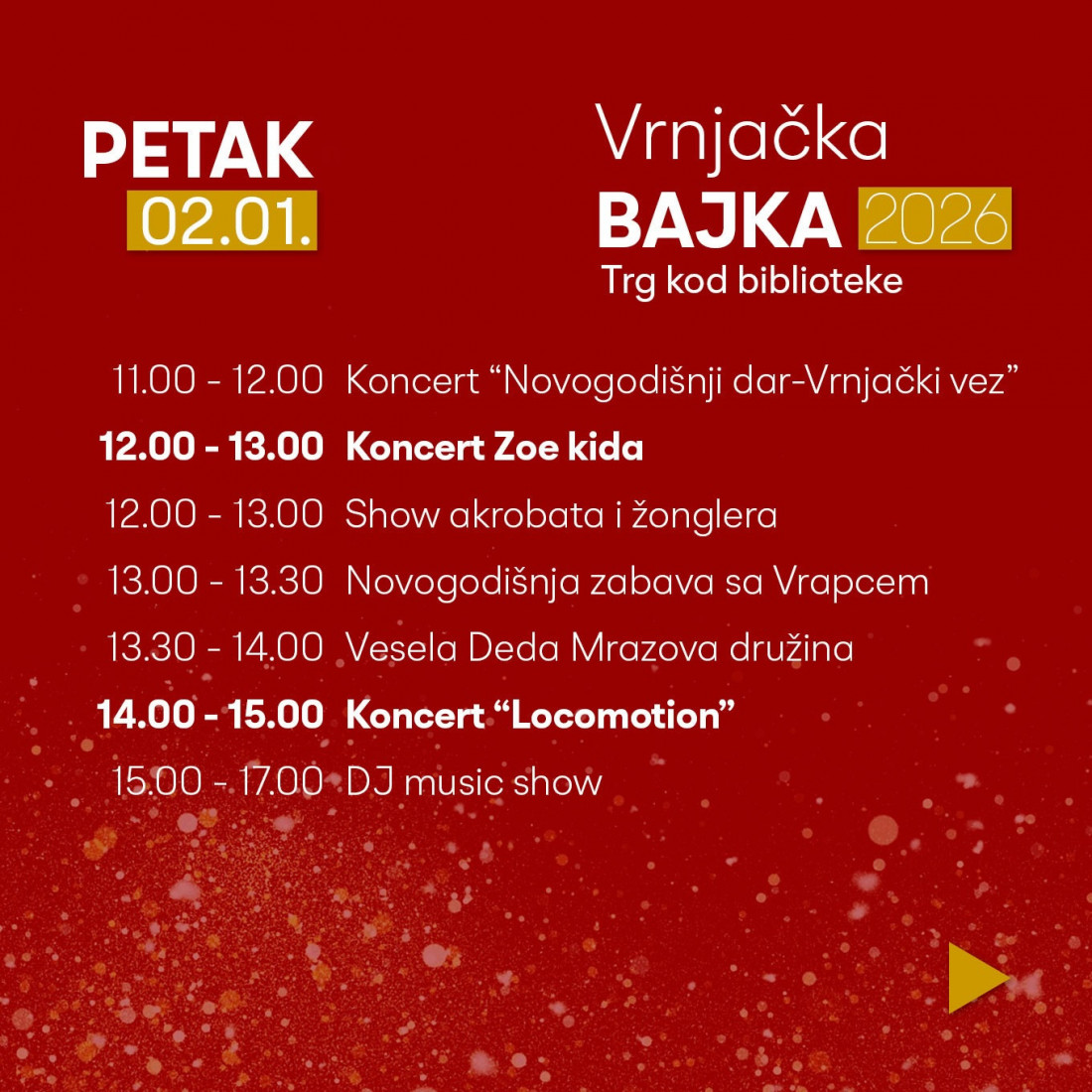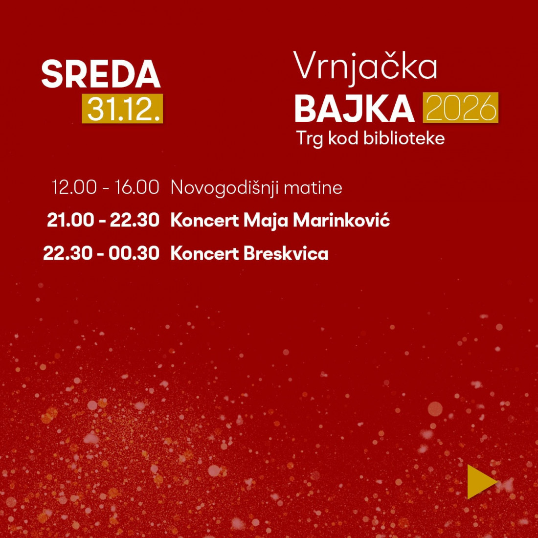Uveče, pored tradicionalnog dočeka Nove godine uz veliki vatromet, posetioce očekuje i muzički program. U okviru bajke na samom Trgu kulture biće i veliki broj novogodišnjih kućica sa hranom, pićem i suvenirima gde će posetioci moći da uživaju.