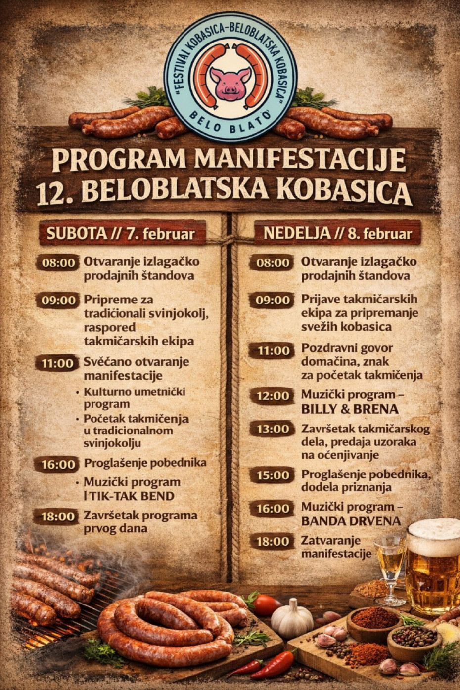 Festival „Beloblatska kobasica“ biće održan u subotu i nedelju, 7. i 8. februara 2026. godine u Belom Blatu kod Zrenjanina.