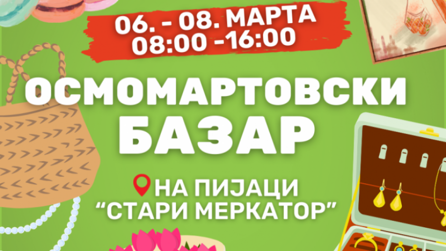 Na pijaci „Stari Merkator“ u petak, subotu i nedelju, 6, 7. i 8. marta u periodu od 8 do 16 časova dizajneri, zanatlije i male porodične radionice izložiće bogat asortiman proizvoda koji mogu biti idealan osmomartovski poklon. Ručno rađeni nakit od najraznovrsnijih materijala, dekorativne šolje, torbe, ešarpe, slike, ukrasne figure od keramike ili oplemenjene dekupaž tehnikom, prirodna kozmetika i slatke poslastice, mogu biti pravi izbor za sve dame.
