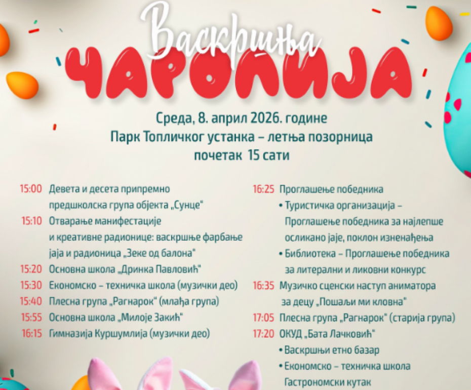 U sredu, 8. aprila 2026. godine, od 15 časova posetioce očekuju kreativne radionice i farbanje jaja, zabavni i muzički nastupi, plesne tačke i animatori, etno-bazar i gastronomski kutak. Iz Turističke organizacije Kuršumlija pozivaju sve da provedu dan uz igru, druženje i prazničnu čaroliju!